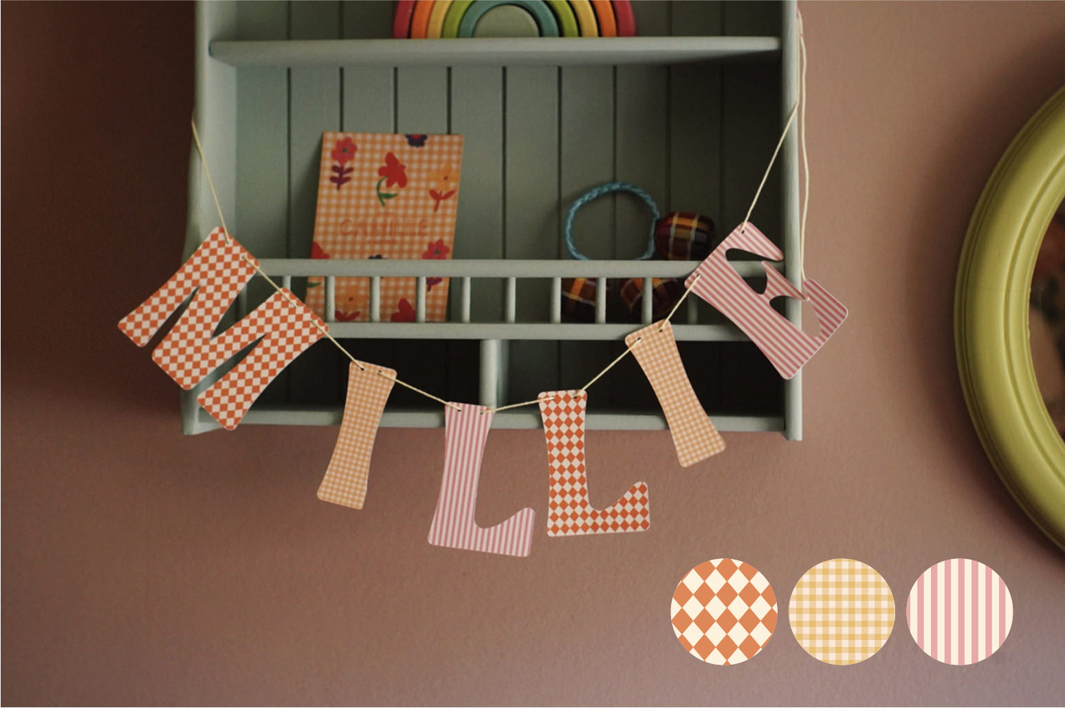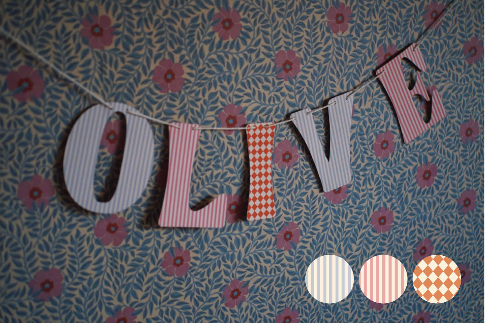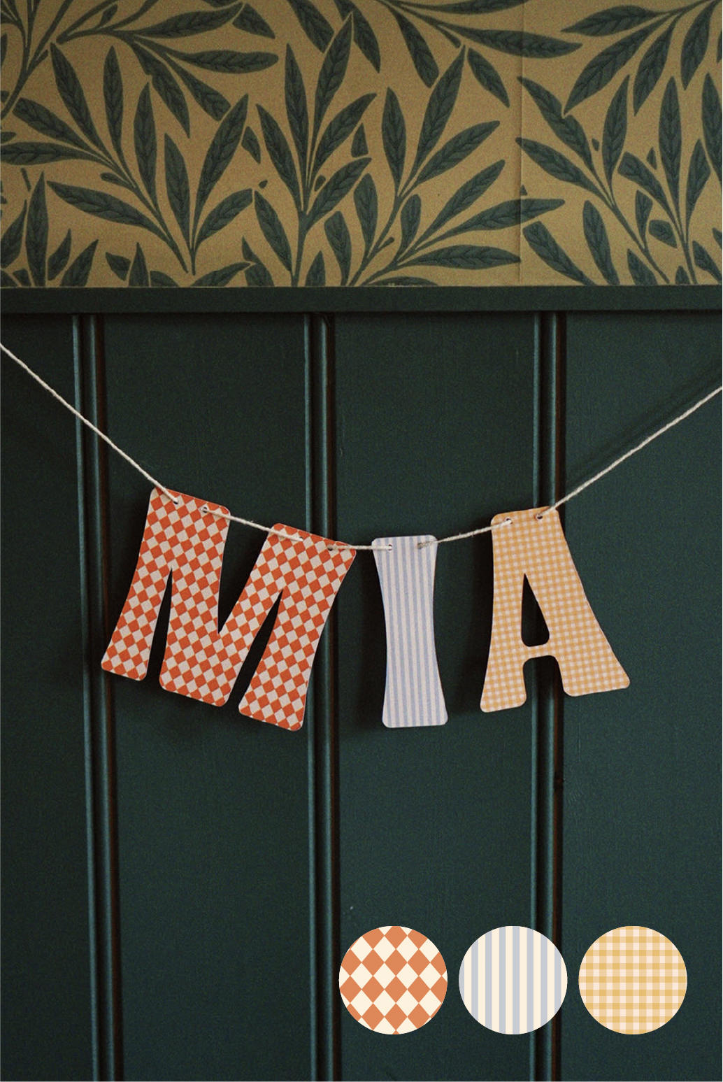 Deze handgemaakte naamslinger kun je ophangen in de kinderkamer, voor het raam bij een geboorte of gebruiken tijdens een verjaardagsfeestje. De slinger wordt speciaal voor jou op maat gemaakt. De patronen op de letters zijn ontworpen door Chien.