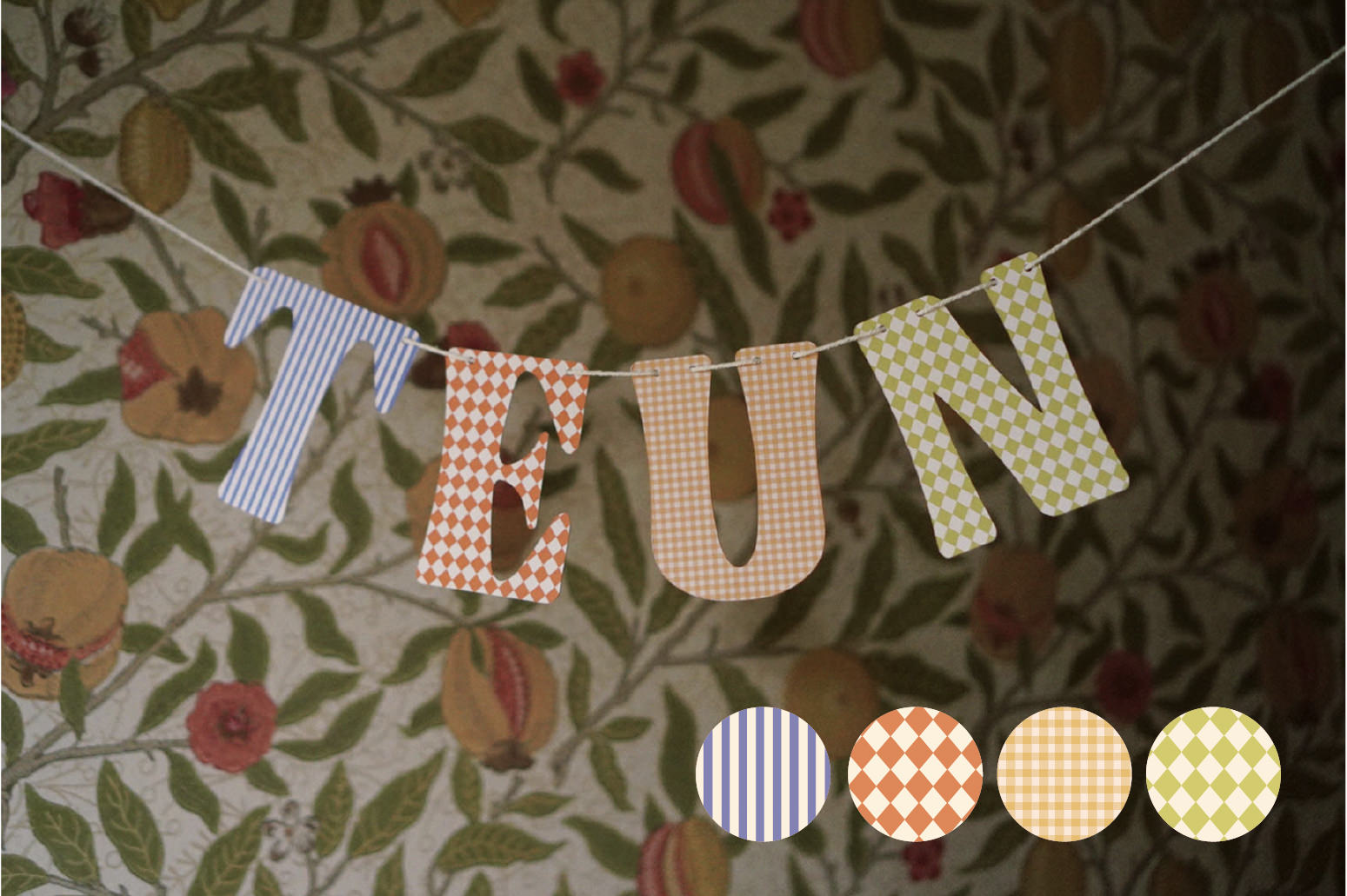Je bestelt een slinger met de naam Ted en kiest drie patronen. Je typt in het tekstvak T: Gingham Geel, E: Ruit Oranje en D: Streep Lichtblauw.