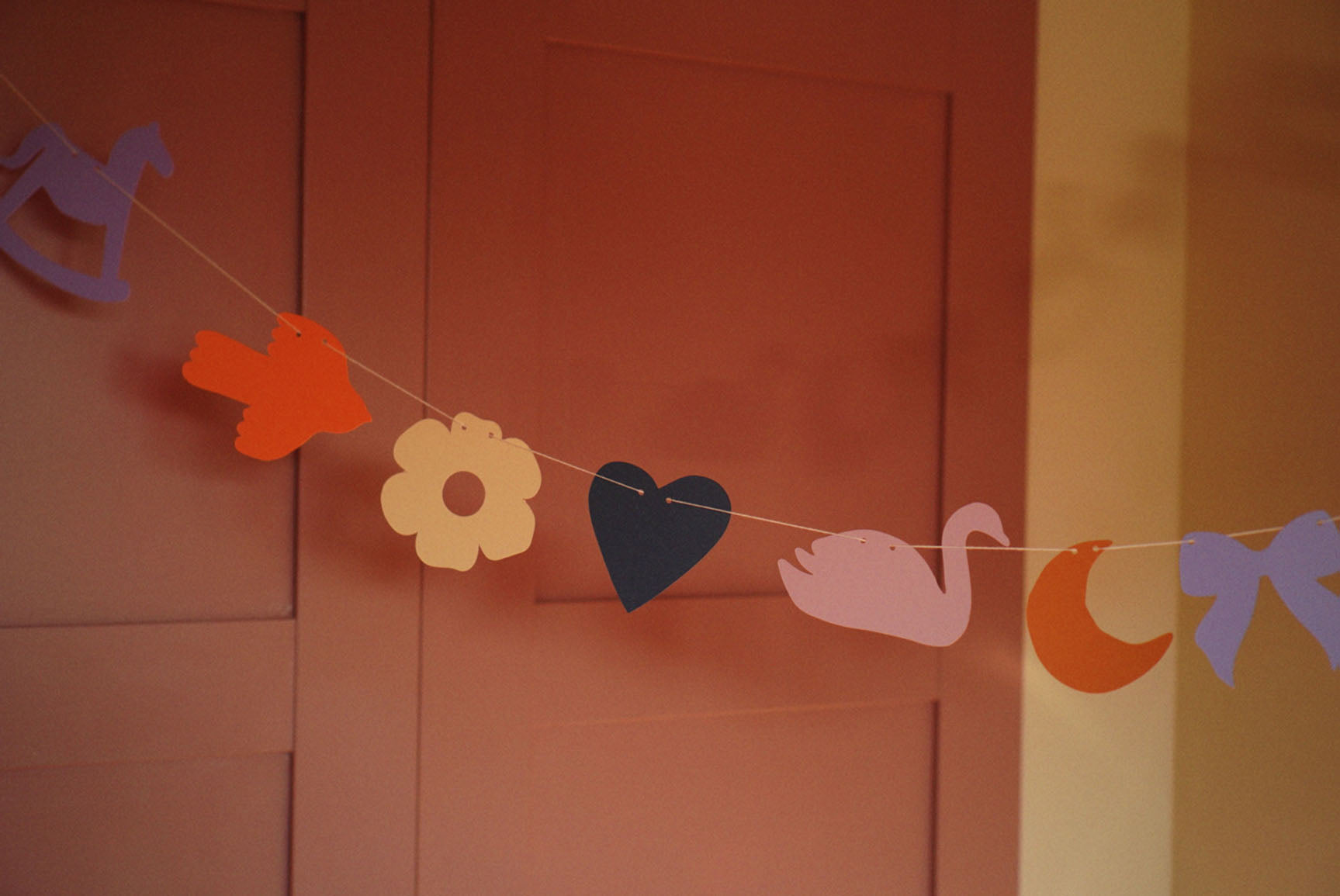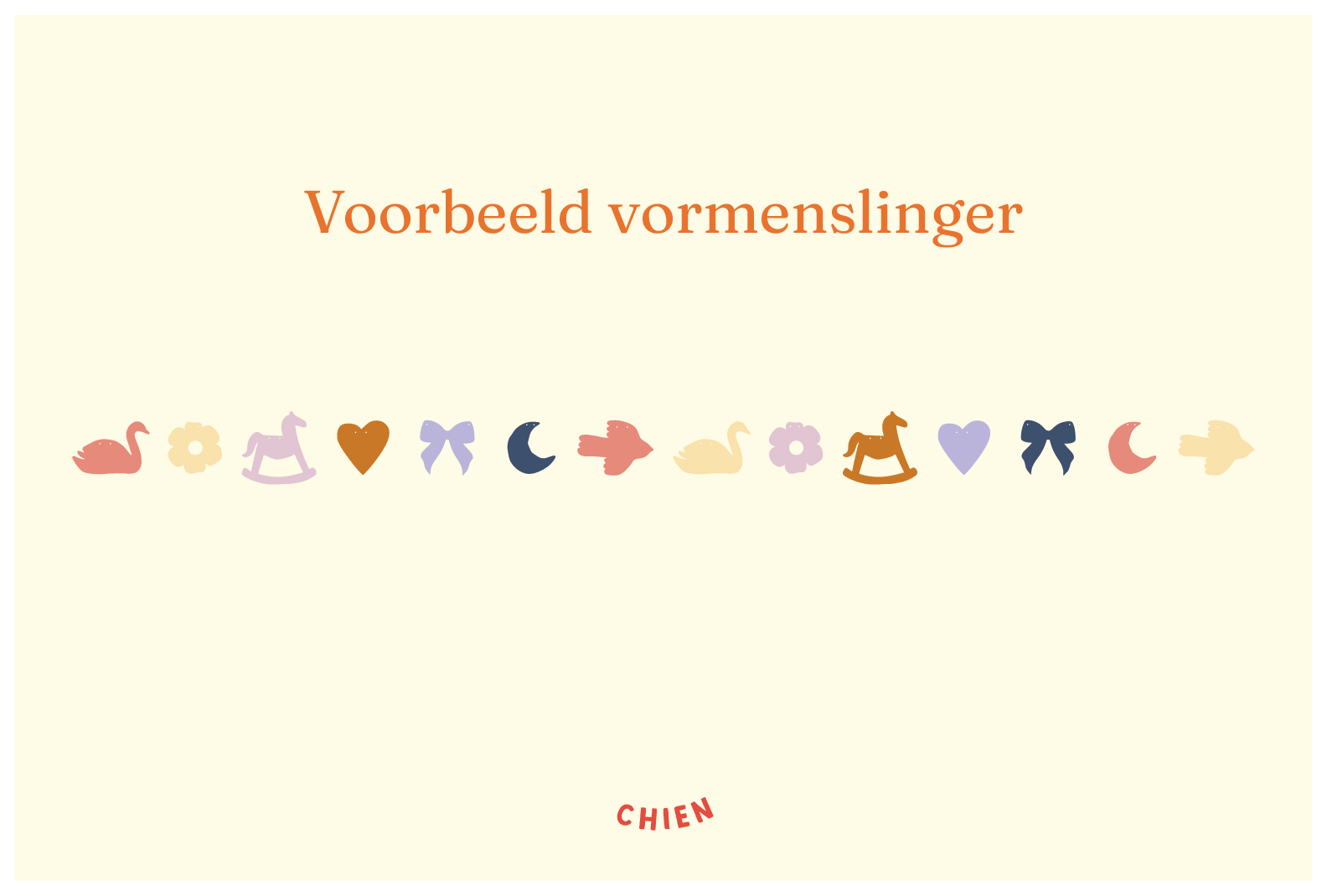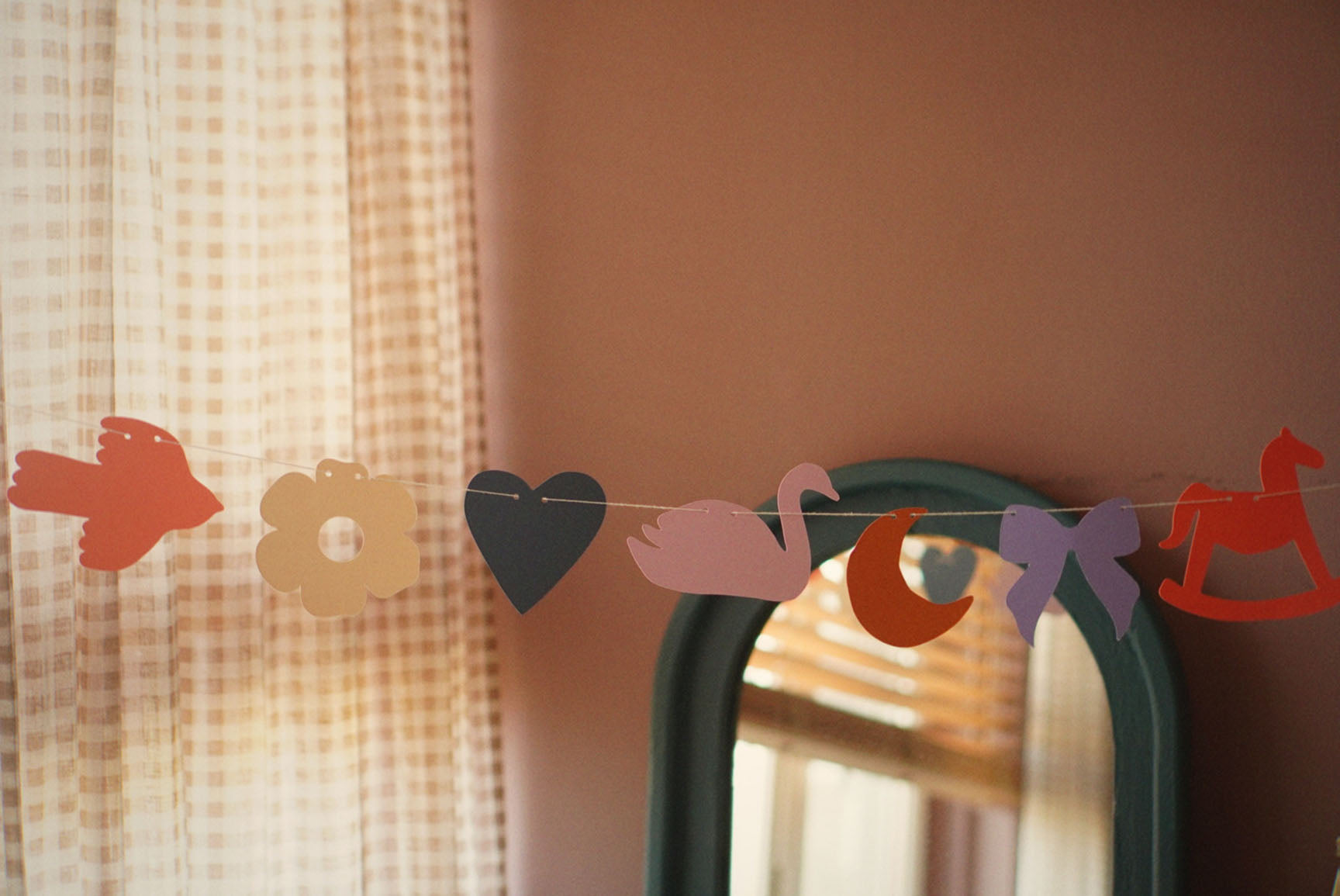 De slinger bestaat uit zeven speelse vormen (zwaan, bloem, strik, maan, vogel, paard en hart) die elk twee keer voorkomen in verschillende kleuren. De volgorde is willekeurig, wat elke slinger uniek maakt! De slinger is ongeveer 1,5 meter lang.